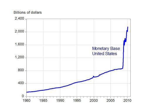 The big bulges in the monetary base are measures of quantitative easing because the monetary base would have continued to grow at relatively steady pace without QE. Japan’s experience with QE was from 2001 to 2006; during those years the monetary base increased from about 65 trillion yen to 110 trillion yen, or by about 70 percent. While QE lasted for a long time it ended very quickly, and the quick exit seemed to go smoothly without volatility in the markets. Note that the post 2008 quantitative easing in Japan is very small compared to 2001-2006; thus Japan does not have an exit problem right now though it is still struggling with a deflation problem and will likely continue with its QE. Unlike the Fed, the BOJ did not think a big quantitative easing was appropriate in the recent crisis.