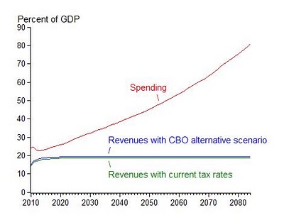 Everyone now seems to agree that the exploding federal debt is a serious problem that must be addressed. But how? The following two charts provide some data to help answer that question. I put the charts together using budget data from CBO’s new Long Term Budget Outlook released on June 30. They take account of the budget effect of latest legislation—including the Obamacare bill.