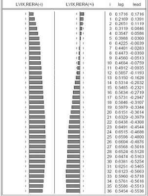 The bar graph on the right (and the second column of numbers) shows the correlation coefficients between the VIX and values of the federal funds rate at varying months going into the future. After the first few months, these correlations are negative and significant indicating that the Fed tends to react to high levels of volatility by lowering interest rates.