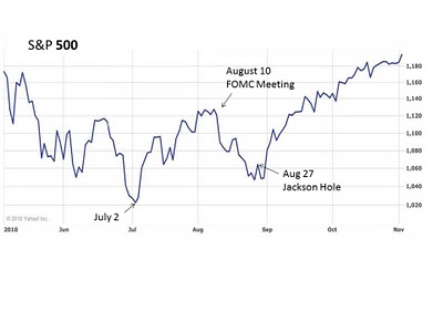 Ben Bernanke’s August 27 Jackson Hole speech was helpful in this regard because it undid the damage of the August 10 meeting, as I argued at the time, by presenting a transparent framework for making decisions and conveying the image of a more functional FOMC than portrayed, for example, in Hilsenrath’s article. So in my view, the consistent story is that the August stock market dip was Fed-induced and its reversal was also Fed-induced. In contrast an explanation based on anticipations of quantitative easing is inconsistent because stock prices went one way on August 10 and another way on August 27.