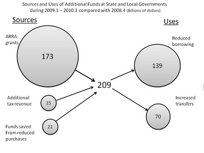 Another example of the problem with the modeling assumptions is the multiplier from “general aid to state governments,” which is assumed to be 1.36 in the Zandi model. Yet the Commerce Department data are very clear that virtually none of this aid to state governments in the 2009 stimulus (ARRA) went into government purchases; most went to reduce borrowing. Here is a diagram from the Commentary article which shows this. You cannot get a multiplier of 1.36, or even much greater than zero, when none of the funds went to government purchases and more than half went to reduced borrowing.