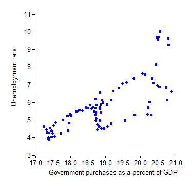Some economists argue that the efforts now underway to reduce government spending as a share of GDP will have adverse effects on unemployment. This is not what the data show. Consider this chart which shows the pattern of government purchases as a share of GDP and the unemployment rate over the past two decades. (The data are quarterly seasonally adjusted from 1990Q1 to 2010Q3.) There is no indication that lower government purchases increase unemployment; in fact we see the opposite, and a time-series regression analysis to detect timing shows that the correlation is not due to any reverse causation from high unemployment to more government purchases.