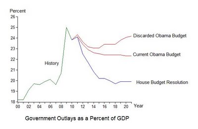 When the Senate voted down the House Budget Resolution (the Ryan budget) by a vote of 40-57, it also voted down an Obama Administration budget (submitted in February) by a vote of 0-97. But the Obama Administration had already discarded that budget when President Obama outlined in general terms a new budget in his speech on April 13. The chart below shows the discarded budget and an estimate of the current budget based on the speech. (The chart is adapted from my April 22 Wall Street Journal oped)