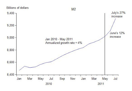 But if you look closely at the lower right of the graph, you can see that this pattern may have shifted recently as the M2 multiplier increased. In fact, over the past couple of months, M2 growth has spurted, as you can see in the next chart showing monthly M2 averages through July.
