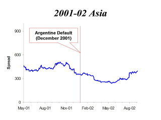 In my view the reason for this remarkable difference is that the IMF and the international policy community was clear (at least following an increase in loans in August 2001) that the bailouts of Argentina would stop, making a debt restructuring inevitable or at least more predictable than the surprise withdrawal of support for Russia in 1998 which caused the contagion then. Contagion is not automatic if the policy is clear and predictable.