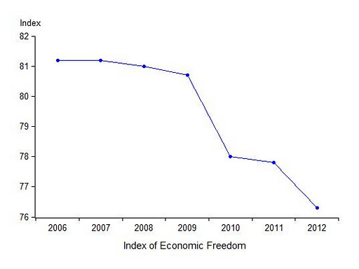 This chart plots the Index from 2006 to 2012. There has been a decline every year since 2007 with a record decline from 2009 to 2010 and another large decline from 2011 to 2012. While nearly every component of the index has declined since 2007, two of the larger declines were due to an increase in government spending as a share of GDP (forcing that component down from 60.3 to 46.7) and a reduction on monetary freedom (bringing that component down from 83.8 to 77.2). The decline in monetary freedom was not due to all the discretionary interventions by the Fed (which the index does not measure), but rather to more government interventions in the price system. Here are the details.
