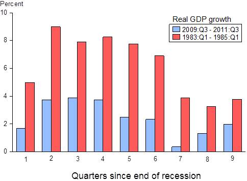 The reason is pretty clear. In the Wall Street Journal piece I refer to and quote from a memo written by President Reagan’s economic adviser George Shultz and others after the 1980 election. It laid out the long run economic strategy they recommended and which Reagan followed. Contrast that with the memo Larry Summers sent to President-elect Obama after the 2008 election, which is making the internet rounds. It laid out the short-run Keynesian policy Summers recommended and which Obama has followed. The big policy differences largely explain the big economic performance differences.