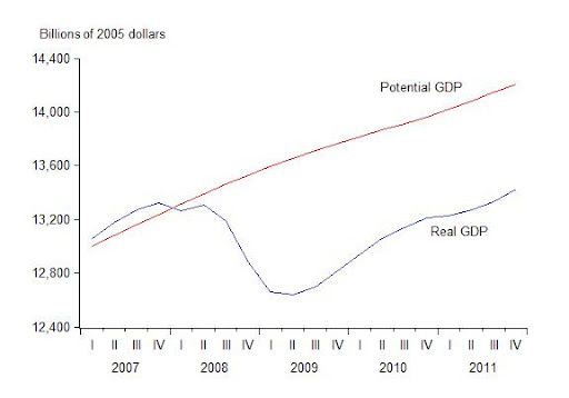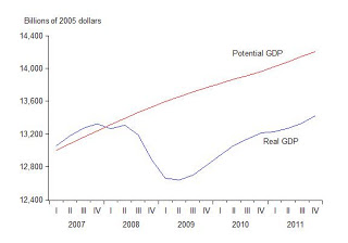 The first chart shows real GDP during the 10 quarters since the end of the 2007-2009 recession along with CBOs recently revised estimate of potential GDP. The chart clearly shows that the economy has yet to recover back to its potential. The only real difference from earlier assessments is that CBO has slightly lowered its estimate of potential.