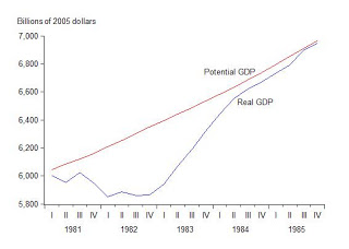 For comparison, the next chart shows the recovery back to potential in the 10 quarters following the 1981-82 recession. The difference between the two charts is striking, and is why one can say that the current recovery is a recovery in name only.