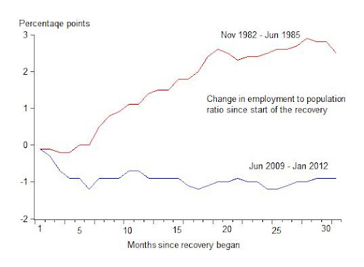 Finally, compare the employment-to-population ratio in the two recoveries as in the next chart. It shows that even with the better news on employment and the unemployment rate, the percentage of the working age population that is actually working is not rising.