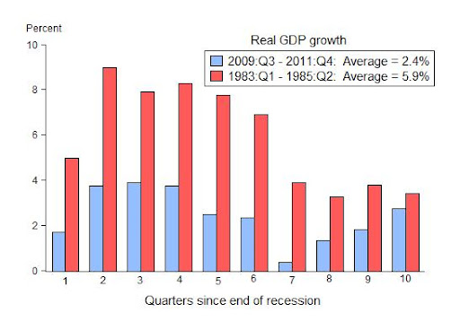 It is also helpful to compare economic growth rates during the two recoveries as shown in the next chart. Growth averaged 2.4 percent in the recent 10 quarters compared with 5.9 percent in the 1980s recovery.