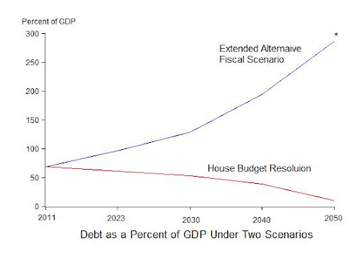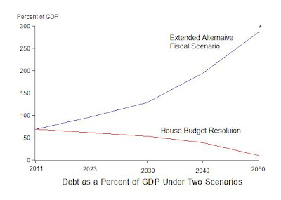 The difference in the federal debt as a fraction of the economy under the two scenarios is shown in the next chart. While CBO projections go through 2050 under the House plan, the CBO does not report numbers greater than 200 percent of GDP in the alternative fiscal scenario. In the chart, I estimated the actual percent by extrapolating the 2011 Long Term Scenario and showing the little star. But no matter how you look at it, the effect on the debt and thus the economy is huge.