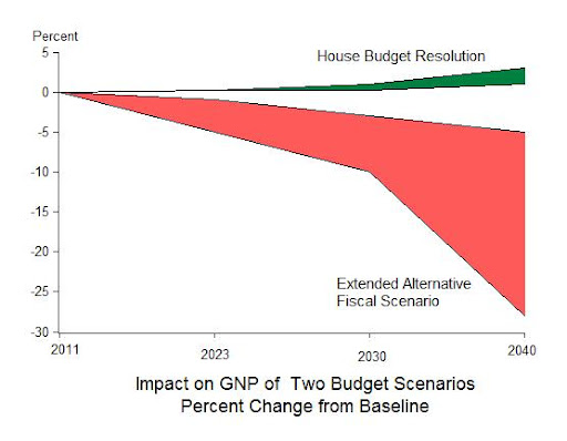 In a recently released report the Congressional Budget Office calculated how debt reduction with the House Budget Resolution (which just passed the House today), would affect GNP in the United States. The CBO took the spending and tax parameters from the House Budget Committee staff and computed the resulting deficit and debt. They then compared the debt path under the House budget with the debt path under their “extended alternative fiscal scenario, which is their description of current law and its most likely extensions. They then estimated the effect of the different debt levels on economic output. This is a “little” dynamic scoring in the sense that other positive effects of lower marginal tax rates and other incentives in the House budget plan are ignored.