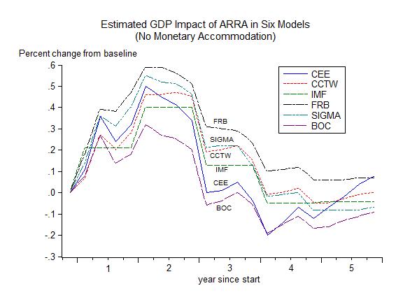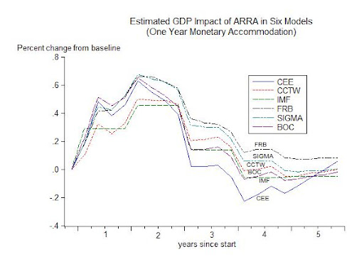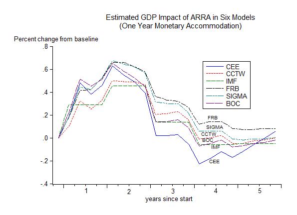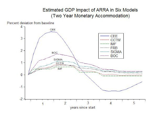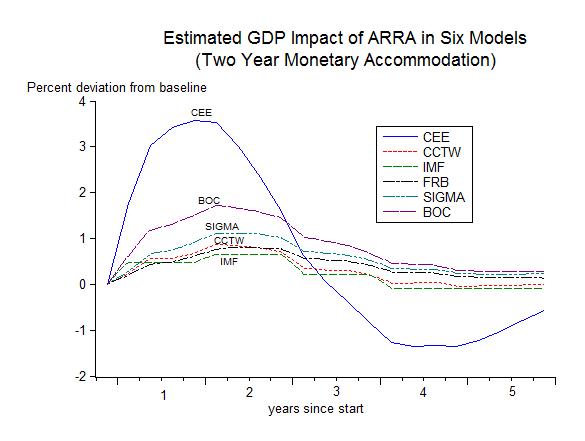 The new paper, Effects of Fiscal Stimulus in Structural Models, is written by 17 authors from central banks and international institutions around the world (Guenter Coenen, Chris Erceg, Charles Freedman, Davide Furceri, Michael Kumhof, René Lalonde, Douglas Laxton, Jesper Lindé, Annabelle Mourougane, Dirk Muir, Susanna Mursula, Carlos de Resende, John Roberts, Werner Roeger, Stephen Snudden, Mathias Trabandt, and Jan in’t Veld). As part of the research reported in the paper the authors compare the CCTW and the CEE estimates of ARRA with four estimated “New Keynesian” structural models of the kind used in practice by policymakers and their staffs. The other four models are: