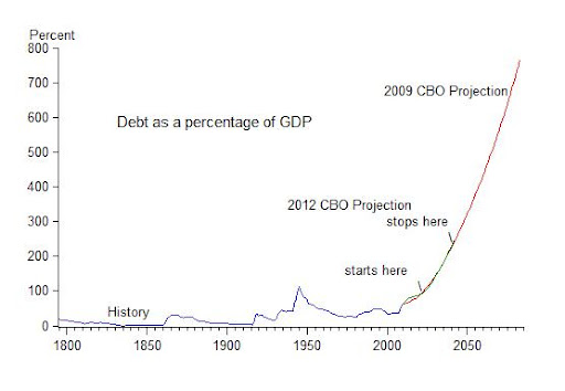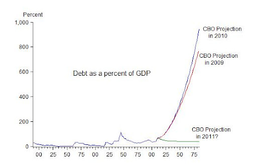 On Independence Day two years ago I wrote a piece comparing America’s exploding debt projection (from the 2009 and 2010 Congressional Budget Office’s Long Term Budget Outlook) with the fireworks on the 4th of July. As I later put it in First Principles (p. 101) the debt projection’s “soaring upward climb resembles the fireworks on America’s Independence Day. But rather than remind us of America’s founding, it portends America’s ending.” Here is the chart I was referring to, hoping that the Congress and the Administration would get their act together so CBO would be able to project something more responsible in 2011.