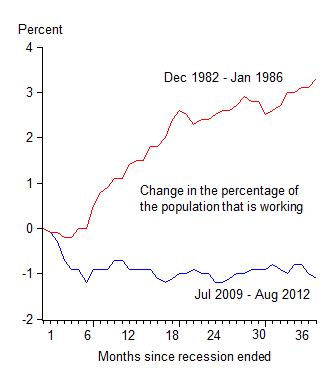 Here is an update of the chart that compares the change in the employment to population ratio in this recovery with the recovery from the deep slump of the early 1980s. This percentage dropped a litttle in August, but the big story is that there has never been a lift off.