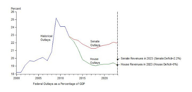 So the obvious differences between the plans are that the Senate would (1) tax more than the House by .7% of GDP, (2) spend more than the House by 2.8% of GDP, and (3) run a deficit larger than the House by 2.1 percent of GDP, where the percentages are based on 2023. Thus the bigger differences are in higher spending and larger deficits. In my view the House proposal is superior on all three counts especially given the sharp increase in spending in the past few years and the steady gradual reversal in the House plan as a share of GDP.