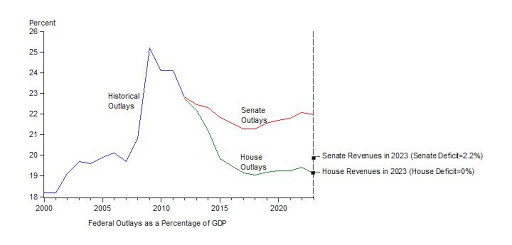 The chart below provides the key year-by-year macro facts needed to compare the House and Senate proposals. In my view this kind of chart is more useful for comparing proposals than the ten-year multi-trillion dollar totals which few people can understand. The chart shows the recent history of federal outlays along with the path of outlays as a percentage of GDP under the Senate proposal and under the House proposal. There is a clear difference of opinion about the future in these two paths. Note how spending gradually comes down to pre-crisis levels as a share of GDP under the House plan and remains high under the Senate plan. The chart also shows where revenues will be as a share of GDP under the two proposals in 2023: 19.1% for the House and 19.8% for the Senate.