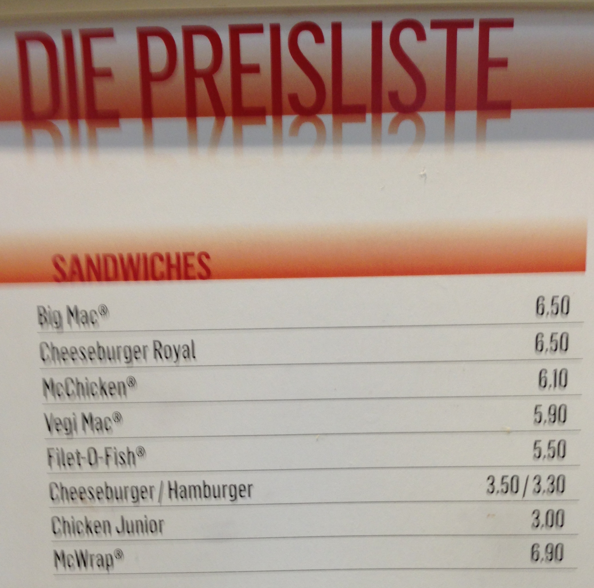 Here’s a price list at the McDonald’s on Barfusserplatz in Basel on the day of the BIS annual general meeting one year ago and today. Big Mac cost 6.50 Swiss francs on both days. Now that’s price stability. At an exchange rate of 1.07 US dollars per Swiss franc that’s $6.96! It would be even pricier in foreign currency without the Swiss National Banks’s minimum exchange rate policy which keeps the franc from becoming even more overvalued.