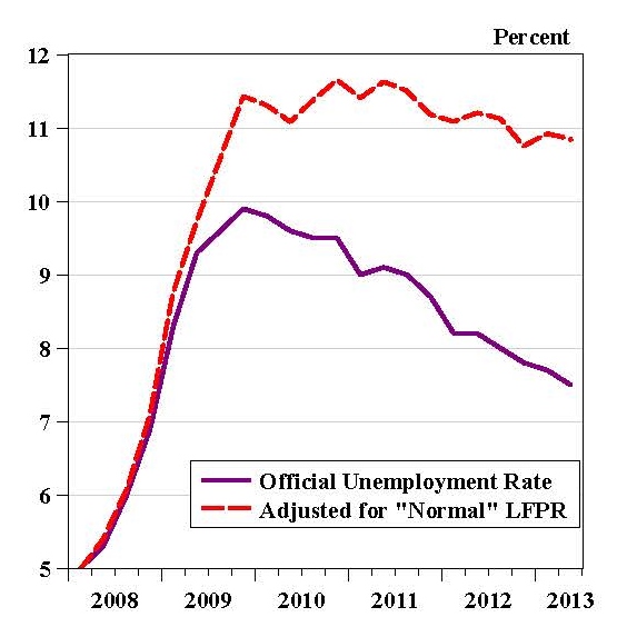 Research by Christopher Erceg and Andrew Levin is providing solid evidence that the decline in the labor force participation rate since 2007 has been due to cyclical factors–the recession and slow recovery–rather than to demographic factors. In other words, the fact that such a large number of people have dropped out of the labor force is associated with the weak economy rather than to their reaching their retirement years–or some other typical demographic trend. Because the unemployment rate does not count the people who dropped out of the labor force it no longer gives a good reading of the state of the labor market. The unemployment rate would be much higher without this large decline in labor force participation.