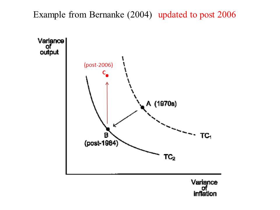 But more seriously, the evaluation of inflation-targeting as a strategy for monetary policy in John’s paper—the main purpose of the paper—was also misleading or at least incomplete. Rather than consider the performance of both inflation stability and output stability—as virtually all monetary policy evaluation studies have done for the past 40 years—he looked only at the first—inflation stability. To paraphrase Milton “the second is at least as important as the first.” Yes we know that inflation has been low and steady in recent years. The problem is that output or employment performance has been terrible—in the US we have had the Great Recession and the Not-So-Great Recovery. That deterioration should be part of the evaluation too.