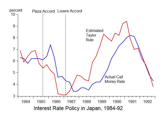 The dates of the Plaza and the Louvre meetings are marked in the chart. Observe how the move toward an excessively restrictive policy starts at the time of the Plaza meeting. Indeed, as chart shows, the Bank of Japan increased its policy rate by a large amount immediately following the Plaza meeting, which was in the opposite direction to what macroeconomic fundamentals of inflation and output were indicating. Then, after a year and a half, starting around the time of the Louvre Accord, Japanese monetary policy swung sharply in the other direction—toward excessive expansion. The chart is remarkably clear about this move. The policy interest rate swung from being up to 2¼ percentage points too high between the Plaza and the Louvre Accord to being up to 3½ percentage points too low during the period of time from the Louvre Accord to1990.
