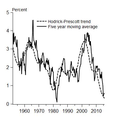 For remarks at a session at the recent AEA meetings on “The U.S. Economy: Where To From Here?” I looked at smoothed trends in labor productivity growth. I produced the graph below showing labor productivity growth for the nonfarm private business sector with high-frequency fluctuations smoothed out using a five-year moving average and a Hodrick-Prescott trend. Note how productivity has swung down and up and down again, roughly in tandem with the changes in policy, giving some evidence of an economic policy–performance cycle, which contrasts greatly with secular stagnation stories and gives hope for another upturn if there is a change in policies.