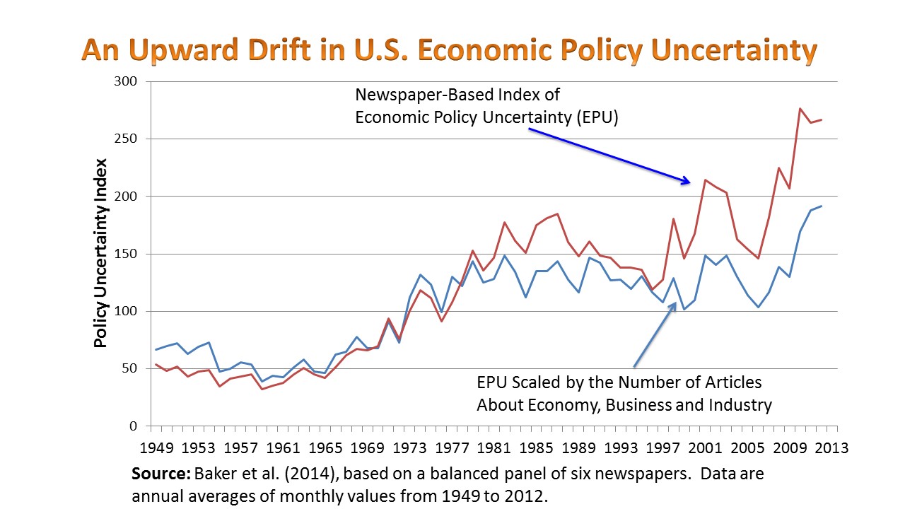 I assessed whether the US is having a much needed turning point in economic policy by applying the ideas in my book First Principles. This chart shows the potential gain in productivity growth if reforms such as regulatory reform and tax reform are implemented; in my view the response to such supply side reforms can be large. Steve Davis then discussed recent trends in regulation, intervention and policy uncertainty, provided new data and making new reform proposal to contain the costs. He provided a chart—which I replicate below—which shows some correlation between the swings in policy uncertainty and historical swings in productivity growth from my chart.