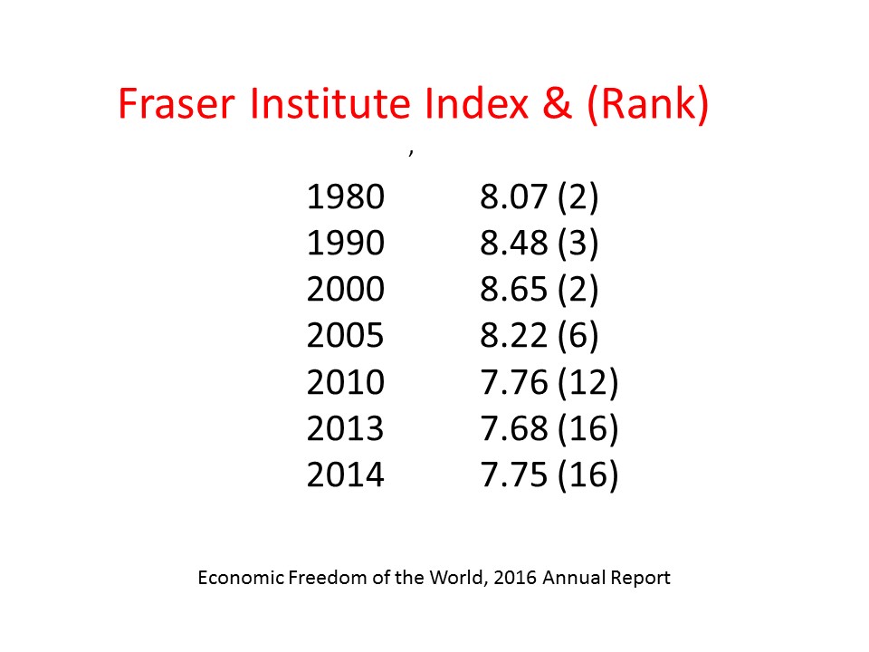 But, as I write in the introduction to the Leeson-Palm book, this most recent resurgence appears to have been cut short as policy has moved away from the principles of economic freedom in recent years as shown by this table of United States data in economic freedom from the Fraser Institute.