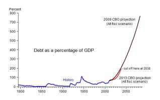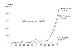 Starting with my first post in 2010 on this topic, CBO reported projections of the debt as a percentage of GDP going out 75 years based on their “alternative fiscal scenario” which is more realistic than their “baseline scenario” that assumes no-change in current law. Here’s what CBO projections made in 2009 and 2010 looked like.