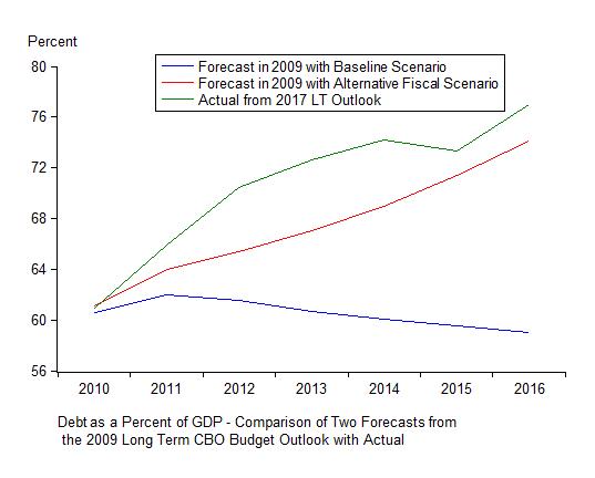 This change was unfortunate in my view. In fact, it turns out that the “alternative fiscal scenario” has been more accurate than the “baseline scenario. To show this I compared the CBO 2010 projection of the debt for the years from 2011 to 2016 with actual debt just reported by the CBO in their March 2017 long-term budget outlook. The next chart shows how much closer the alternative fiscal scenario is to what actually transpired compared with the baseline scenario.