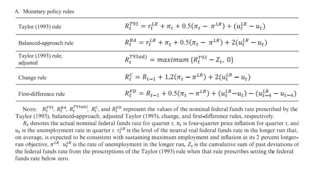 More information, including some algebra, is given in Figure A which is reproduced below. It is good that one of the five policy rules–which the Fed calls the “Taylor (1993) rule, adjusted”–is based on the important 2000 research paper by David Reifschneider and John Williams on the zero lower bound which I have written about here. Note that the Fed describes these rules using the unemployment rate rather than real GDP, relying on an empirical connection between the real GDP/potential GDP gap and the unemployment rate (Okun’s law). Note that what the Fed calls the “balanced-approach rule” is the Taylor rule with a different coefficient on the cyclical variable