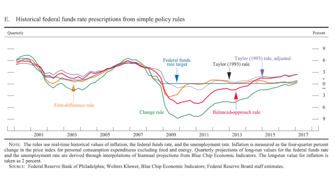 The Federal Reserve Board’s semi-annual Monetary Policy Report issued by Chair Janet Yellen last Friday contains a whole new section called “Monetary Policy Rules and Their Role in the Federal Reserve’s Policy Process.” The section contains new information and is well worth reading. Below is an excerpt which first lists three “key principles of good monetary policy” that the Fed says are incorporated into policy rules; it then lists five policy rules, including the Taylor rule and four variations on that rule that the Fed uses, with helpful references in notes which are also excerpted below.