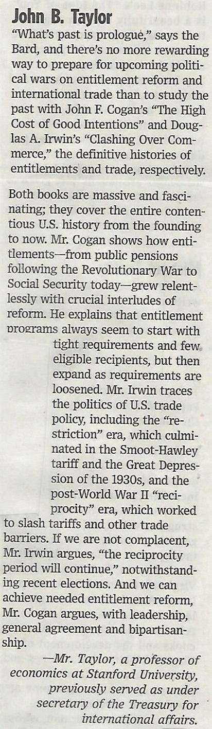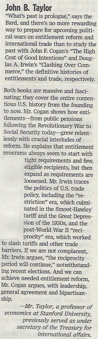 This year I chose two amazingly relevant books on U.S. economic history: John Cogan’s The High Cost of Good Intentions: A History of U.S. Federal Entitlement Programs and Doug Irwin’s Clashing over Commerce: A History of US Trade Policy. My reasons in brief are found in the passage below from the printed December 16 WSJ edition. In these days of big economic policy changes, history is essential, and if I had room for a third book, it certainly would be another economic history, namely Tom Hazlett’s The Political Spectrum: The Tumultuous Liberation of Wireless Technology, from Herbert Hoover to the Smartphone.