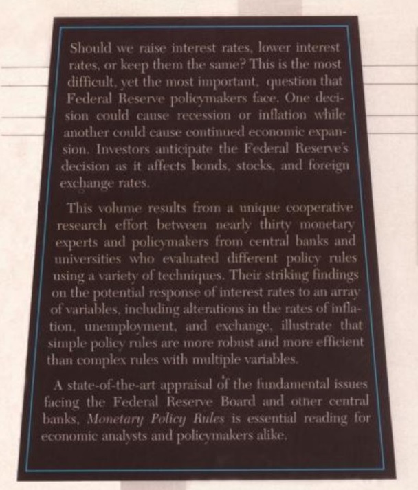 It was an unusual conference. As stated on the back of the book jacket shown below, it was a “unique cooperative research effort between nearly thirty monetary experts and policymakers.” The purpose was to evaluate alternative monetary policies, all of which were described by policy rules for the interest rate. It was unique because the participants in the conference not only evaluated the performance of their own proposed policy rules with their own models, they also evaluated the performance of other participants’ proposed rules with their models. This put the focus on robustness and effectiveness in a way that had not been done before.