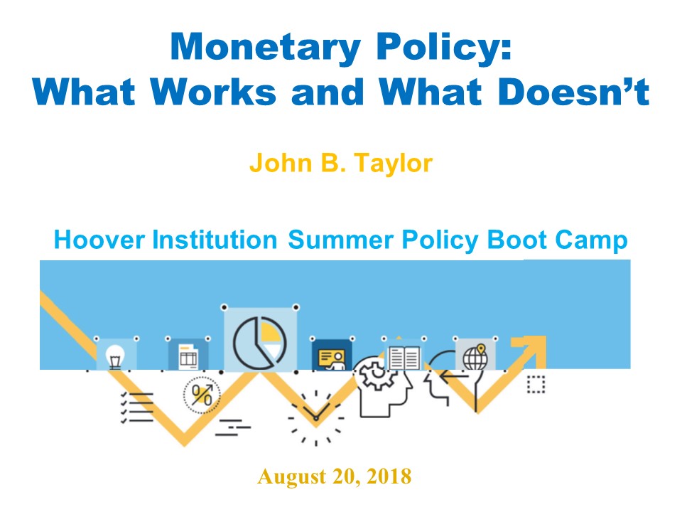 Other policy topics during week include tax policy, budget policy, public pensions, immigration, education, environmental policy, health care, regulatory policy, foreign policy and domestic politics. The teachers in the program are faculty and fellows from the Hoover Institution, including experts with experience in economics, government, law, history, political science, and foreign policy. The lineup this summer includes Scott Atlas and Josh Rauh (the conference organizers) along with Terry Anderson, Michael Auslin, Michael Boskin, David Brady, John Cogan. Michael McConnell, James Ellis, Morris Fiorina, Stephen Haber, Victor Davis Hanson, Daniel Heil, Caroline Hoxby, Edward Lazear, Amit Seru, George Shultz, Kiron Skinner, Bill Whalen, and John Yoo, with guest dinner speakers Joe Lonsdale, Amy Wax, and Jason Riley. A series of videos on the various topics is planned for the future.