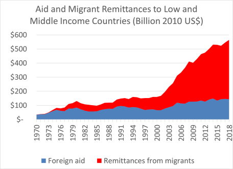 The importance of remittance flows to low and middle income countries is the subject of an important recent tweet from William Easterly @bill_easterly. His tweet includes this amazing chart: