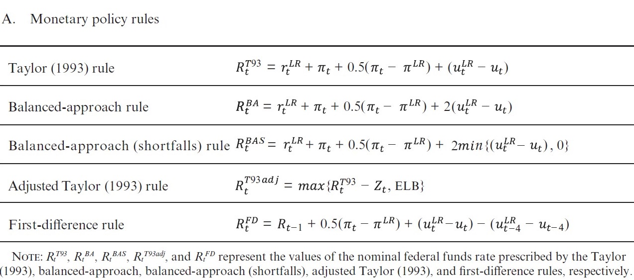 Five rules are discussed in the February 2021 Monetary Policy Report, especially on pages 45 through 48. To quote the Report, these include “the well-known Taylor (1993) rule, the ‘balanced approach’ rule, the ‘adjusted Taylor (1993)’ rule, and the ‘first difference; rule. In addition to these rules” and this is very important, there is a new “‘balanced approach (shortfalls) rule,’ which represents one simple way to illustrate the Committee’s focus on shortfalls from maximum employment.” Here is a table of rules from the Report: