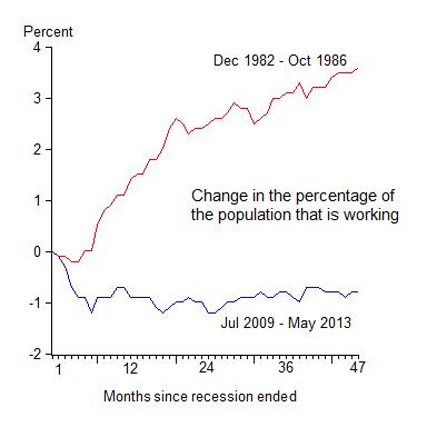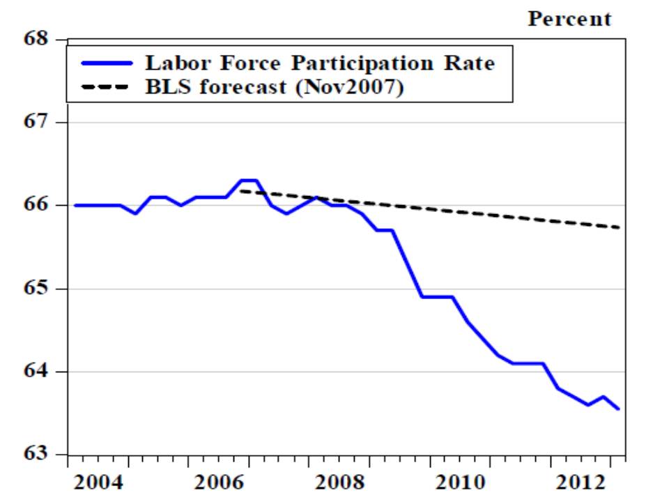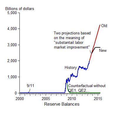 The red line shows a projection consistent with the assumption that the $85 billion would continue until the unemployment rate hit 6.5 % (which until today was one interpretation of the “substantial labor market improvement” criterion) in which case tapering would have started in mid-2015. Note that this is essentially a continuation of the recent history (blue line).