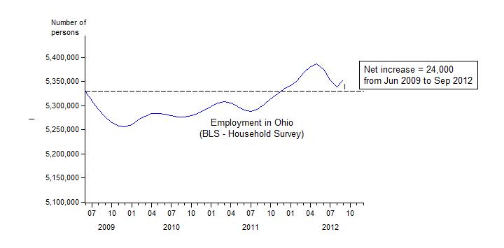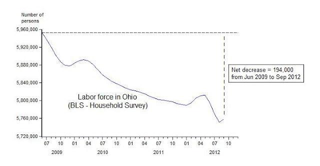 By the official definition of the Bureau of Labor Statistics, unemployment in Ohio fell by 218,000 persons since the national recession ended and so-called recovery began in June 2009. But the vast amount of the decrease in unemployed was due to 194,000 persons leaving the labor force. There were only 24,000 additional jobs. In other words, 9 of 10 workers who had been counted as unemployed are no longer counted as unemployed simply because they are no longer looking for work. Were it not for this decline in the labor force, the unemployment rate would be around 10% rather than the 7% mentioned by the Times.