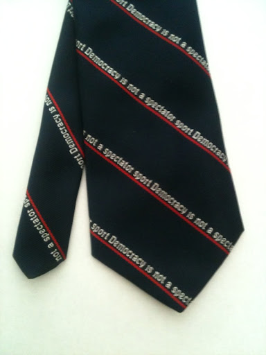 But this will not happen if the political campaign drifts back away from substance as campaigns so often do. Keeping the debate focused on economics requires that economists participate and not merely sit back and watch. To remind myself of this, I like to wear this “Democracy is not a spectator sport” tie a lot during the election season.