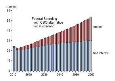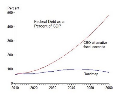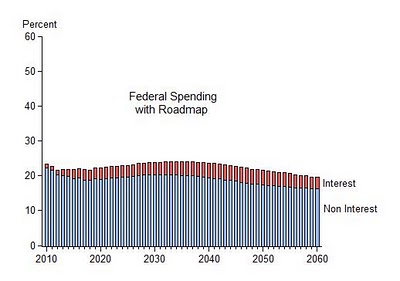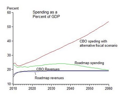 The second chart shows spending and taxes under the Roadmap and the CBO Alternative; the Ryan Roadmap focuses on controlling the growth of spending as a share of GDP, which makes sense because that is where the growth of the deficit is coming from.