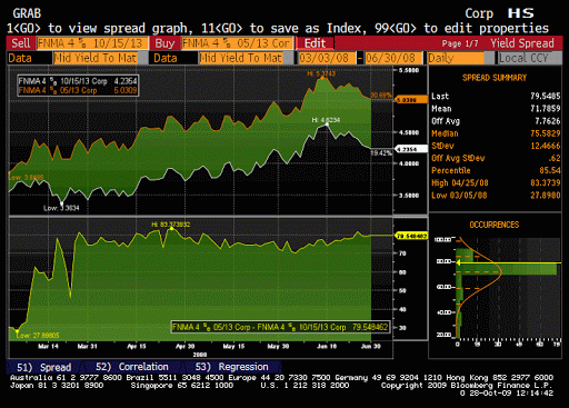 The second chart covers the period from March 2008 through June 2008. Observe that the spread jumped to around 80 basis points after the Bear Stearns intervention. Unlike many other risk spreads it did not come back down after Bear Stearns.