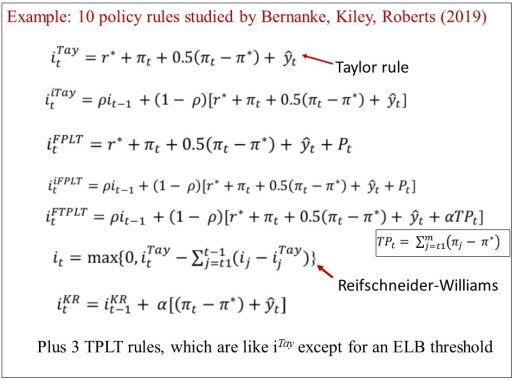 And the evidence goes beyond these conferences. Some have looked at other instruments such as the money supply, including Belognia and Ireland (2019), but most others continue to look at interest rate instruments. Bernanke, Kiley and Roberts (2019) examined ten different monetary policy rules for the instruments using the FRB/US model. The ten interest rate rules are in this table: