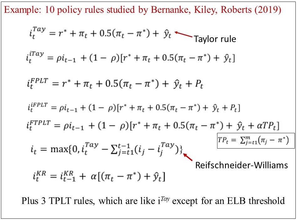 And the evidence goes beyond these conferences. Some have looked at other instruments such as the money supply, including Belognia and Ireland (2019), but most others continue to look at interest rate instruments. Bernanke, Kiley and Roberts (2019) examined ten different monetary policy rules for the instruments using the FRB/US model. The ten interest rate rules are in this table: